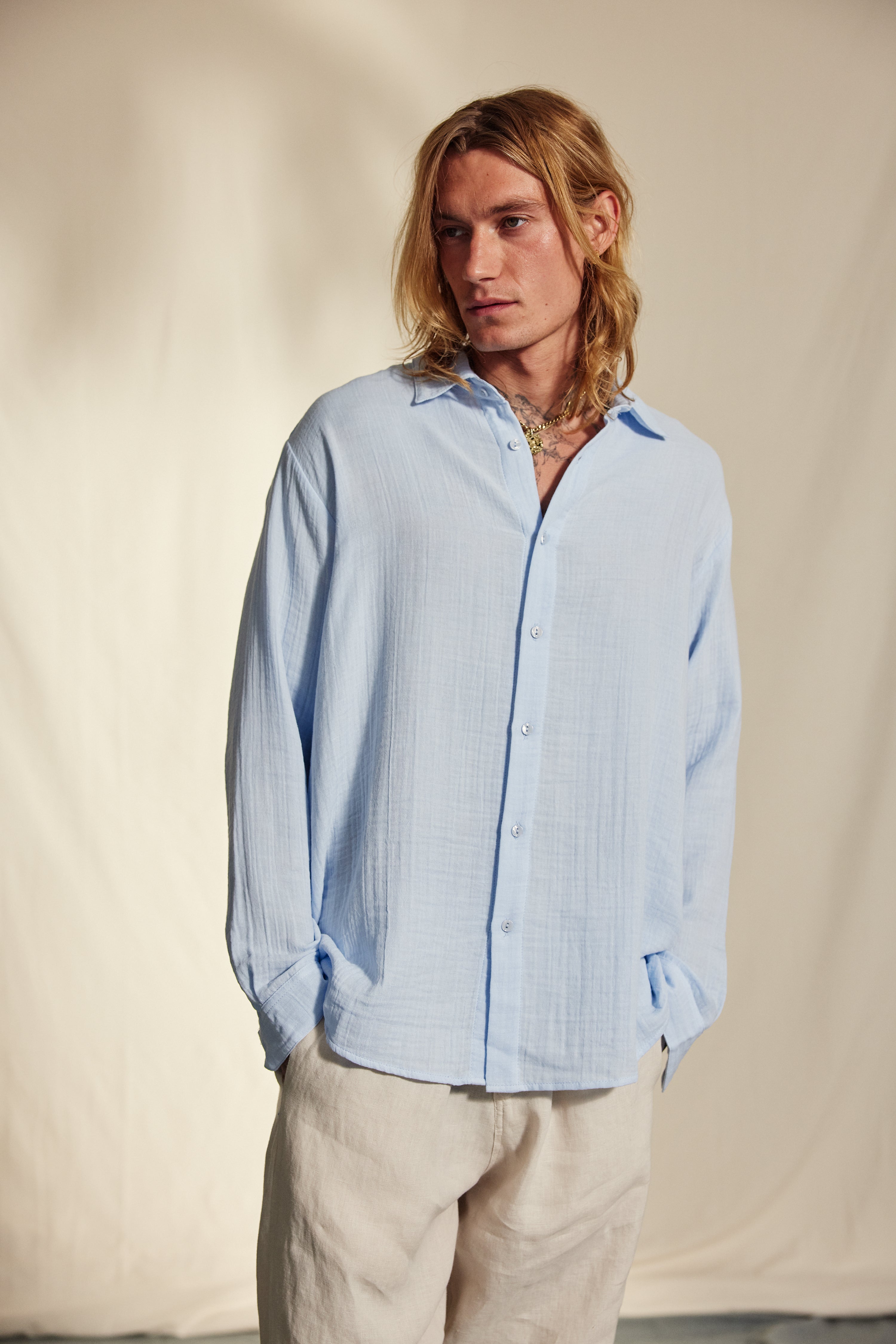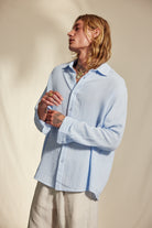 Hooper cotton crincle shirt, a stylish and versatile piece inspired by classic men’s tailoring. This light crepe cotton shirt features elegant pearl buttons at the front and cuffs. Designed with a Straight bottom and loose fit, it offers a slightly oversized silhouette that flatters both men and women. Perfect for all warmer days ahead.