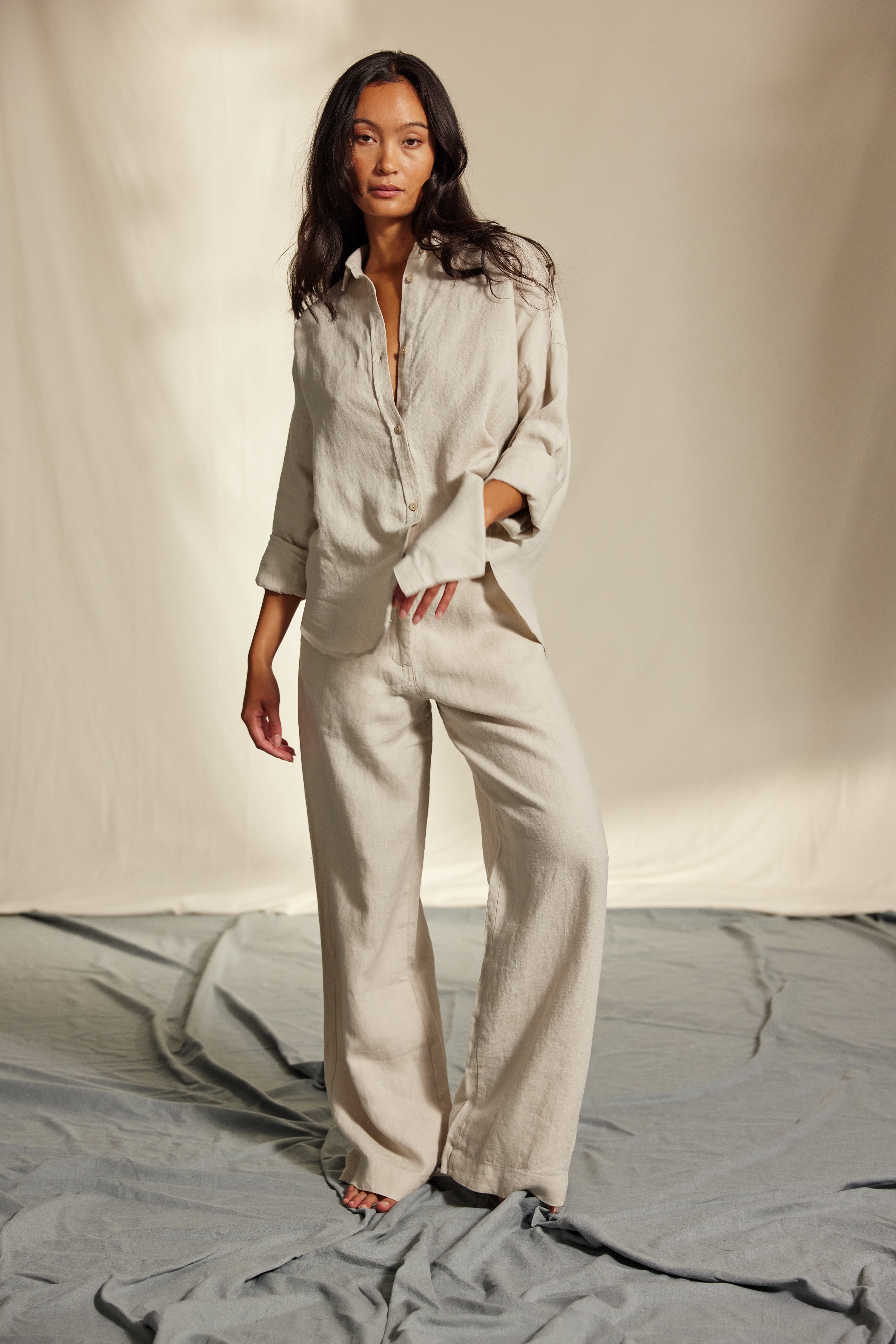 Hooper shirt in washed linen is a stylish and versatile piece inspired by classic men’s tailoring. This soft linen shirt features elegant black pearl buttons at the front and cuffs. Designed with a Straight bottom and loose fit, it offers a slightly oversized silhouette that flatters both men and women.